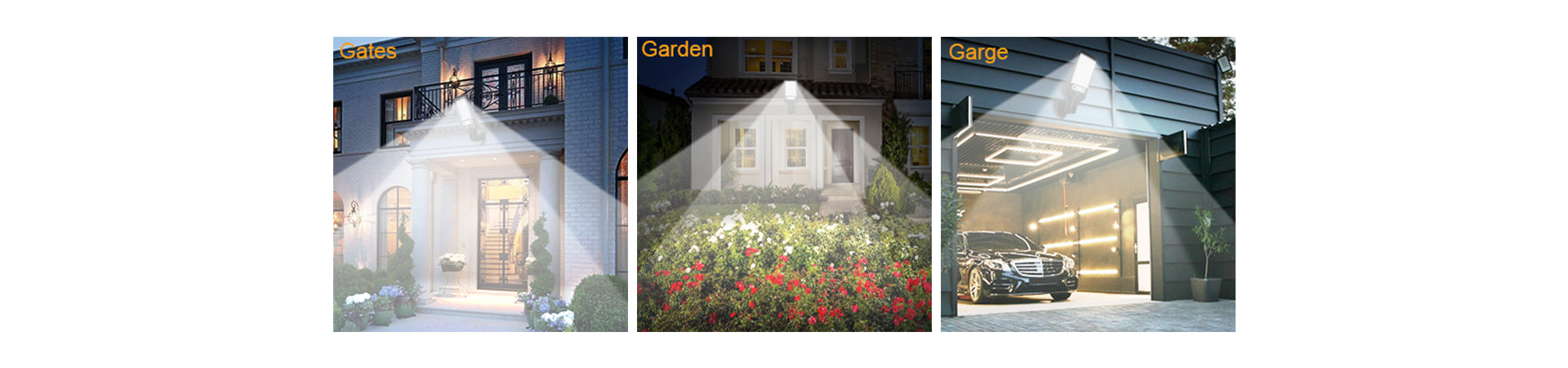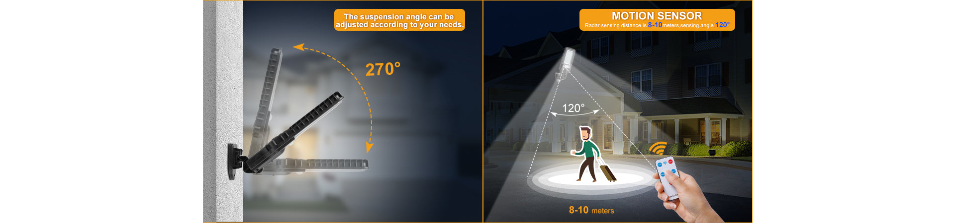 La luz exterior LED alimentada por energía solar, ajustable 270° hacia arriba y hacia abajo, ilumina una amplia gama de áreas para proporcionar más visibilidad y está equipada con un sensor de movimiento de precisión PIR que puede detectar un ángulo de iluminación amplio de 120° y una distancia de detección de 26 pies para proteger eficazmente su hogar