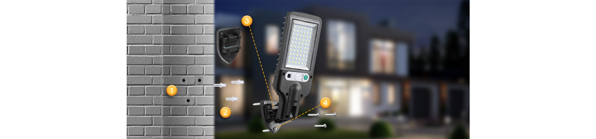 No es necesario comprar pilas ni cables, esta luz solar se puede montar en el lugar adecuado, aleros, paredes, pilares, etc., con tornillos, herrajes giratorios, etc., según sus preferencias.