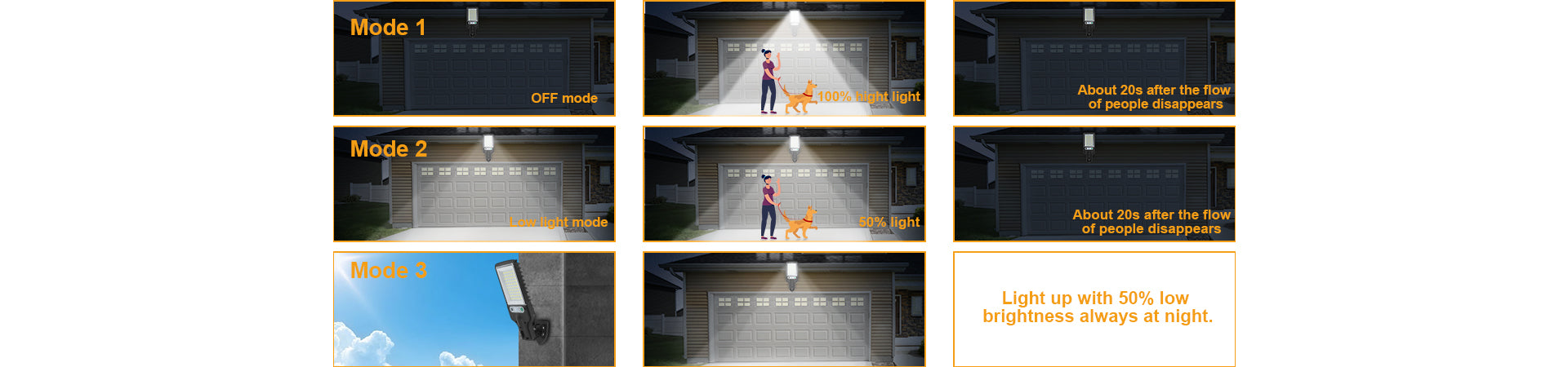 KOSCHEAL luz solar exterior incluye modo de detección de cuerpo, detección de cuerpo + modo de luz baja y modo de luz baja para satisfacer sus diversas necesidades de iluminación exterior.