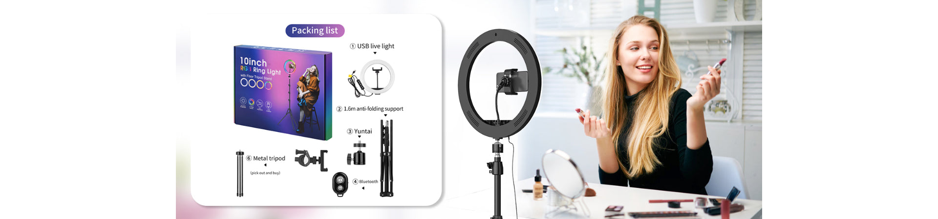 RGB Music Follow Mode: Activate the music rhythm function to have the RGB ring light flash, fade, or breathe in sync with the beat of the music. Perfect for various scenarios such as singing and dancing parties, YouTube video recordings, photography, makeup streaming, and more.